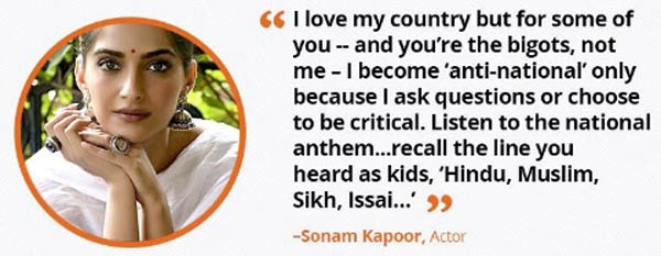 এক সর্বভারতীয় সংবাদমাধ্যমে সোনম কপূর লিখেছেন—“আমি দেশকে ভালবাসি। কিন্তু কিছু লোক অন্ধ। সমালোচনা করলেই আমি দেশদ্রোহী হয়ে যাই। জাতীয় সঙ্গীত শুনুন। কী লাইন আছে তাতে? হিন্দু, মুসলিম, শিখ ইসাই…’’