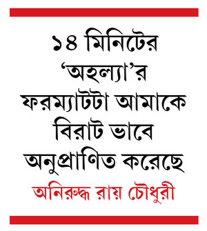কিন্তু আট মিনিটের ছবি করে কি ফিচার ছবির আনন্দ পাওয়া যায়? অনিরুদ্ধ বলছেন, ‘‘বিজ্ঞাপনী ছবি করি তিরিশ-চল্লিশ সেকেন্ডের মেয়াদে। সেখানেও একটা গল্প বলা হয়। এবং অ্যাড ফিল্ম করিয়েরা সে কাজ করে তৃপ্তিও পান। আর আট মিনিটের ছবি তো অনেক বেশি সময়। এ ছবি করে তো আনন্দ পাবই। অ্যাড ফিল্ম করার অভিজ্ঞতা আছে বলেই এই ধরনের কম সময়ের কাজ করতে ভাল লাগবে।’’