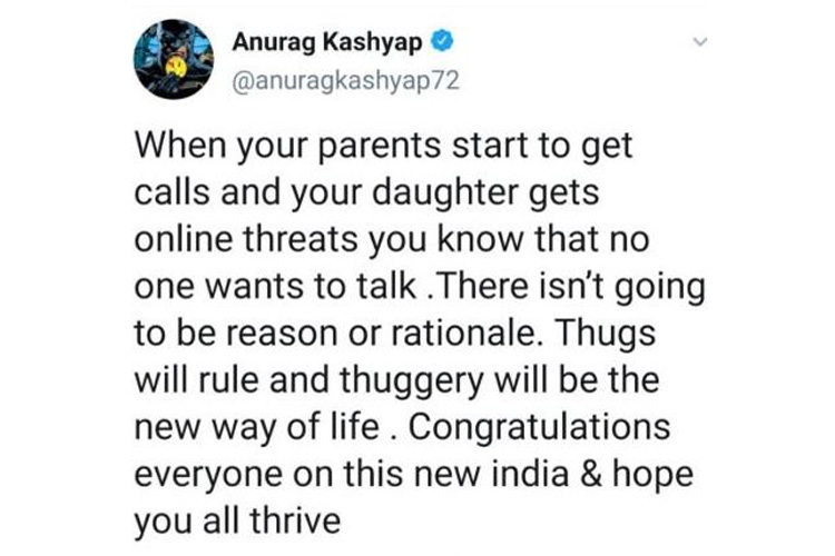 শনিবার অনুরাগ দু’টি টুইট করেন। প্রথম টুইটে তিনি লেখেন, ‘যখন আপনার বাবা মা-কে লাগাতার ভয় দেখানো হবে, সন্তানকে অনলাইনে হুমকি দেওয়া হবে, আপনাকে বুঝতে হবে আপনি কথা বলুন, এমনটা কেউ চায় না। হিংসার রাজ শুরু হয়েছে। নতুন ভারতে সকলকে শুভেচ্ছা।’এর কিছুক্ষণ পরেই বিদায়ী টুইটটিতে তিনি লেখেন, ‘প্রত্যেককে শুভকামনা জানাই। এটাই আমার শেষ টুইট। কারণ টুইটার ছাড়ছি আমি।নির্ভয়ে মনের কথা বলতেই যদি না পারি, তাহলে কথা না বলাই ভাল। বিদায়।’