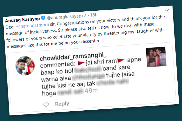 নির্বাচনের দিন ঘোষণার পর থেকেই তুমুল প্রচার শুরু করেছিল বিজেপি শিবির। বাদ পড়েনি সোশ্যাল মিডিয়াও। প্রধানমন্ত্রী নরেন্দ্র মোদী নিজেকে দেশের ‘চৌকিদার’ বলে ব্যাখ্যা দেন। সে কারণেই বিজেপি সমর্থকেরা টুইটে নিজেদের নামের আগে ‘চৌকিদার’ শব্দটি ব্যবহার করছেন বেশ কিছু দিন ধরেই। তেমনই জনৈক ‘চৌকিদার রামসঙ্ঘী’ অত্যন্ত অশালীন ভাষায় আক্রমণ করেছেন অনুরাগের মেয়েকে। তাঁর মেয়েকে ধর্ষণের হুমকি দিয়েছেন তিনি। সেই টুইট নরেন্দ্র মোদীকে ট্যাগ করে শেয়ারও করেছেন অনুরাগ।