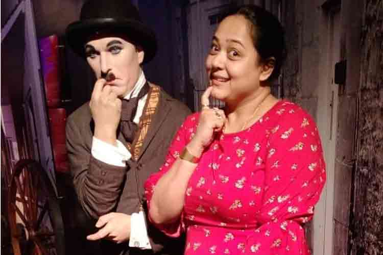 চার্লির মূর্তির পাশে অভিনেত্রী।