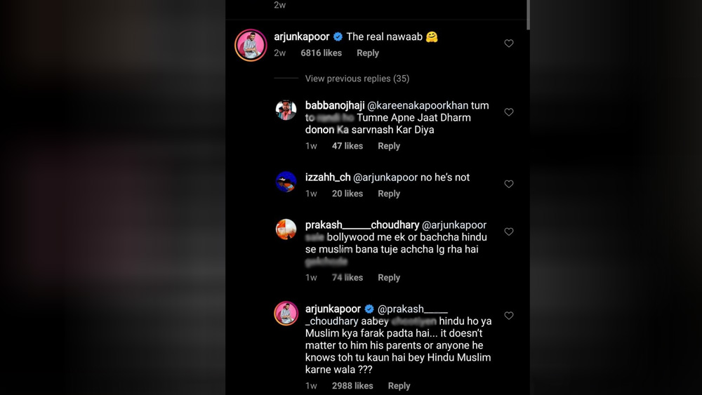 শুধু তাই নয়, করিনা কেন সইফকে বিয়ে করেছেন তা নিয়েও করিনাকে উদ্দেশ্য করে উড়ে আসতে থাকে নানা ধরনের কুৎসিত মন্তব্য। ঠিক এমন সময়েই করিনার পাশে দাঁড়ান অর্জুন। লেখেন, “ও হিন্দু বা মুসলিম যা-ই হোক না কেন তাতে আপনার কী? ওর বাবা- মা’র কাছেই যখন এই ব্যাপার গুরুত্ব পায়নি কোনওদিন তখন আপানার এত মাথাব্যথা কিসের জন্য?