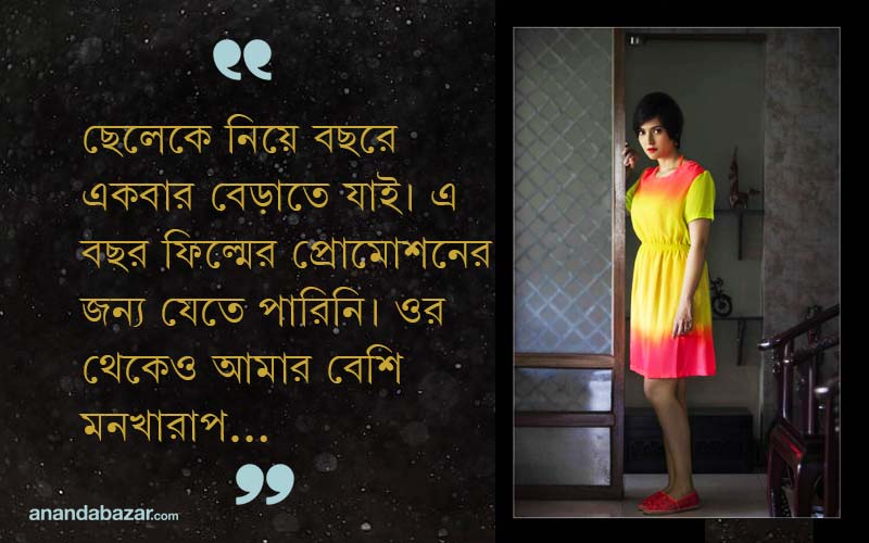 কলকাতায় এলে ছেলের সঙ্গে ছবি দেখি। কিন্তু মিশুক বাংলাটা বুঝতে পারে না। ফলে বাংলা ছবি ফলো করতে পারে না। ও ছোট থেকে বাইরে থাকার জন্য বাংলা লিখতে বা পড়তে পারে না। বলতে পারে, তবে সেটাও বেসিক।