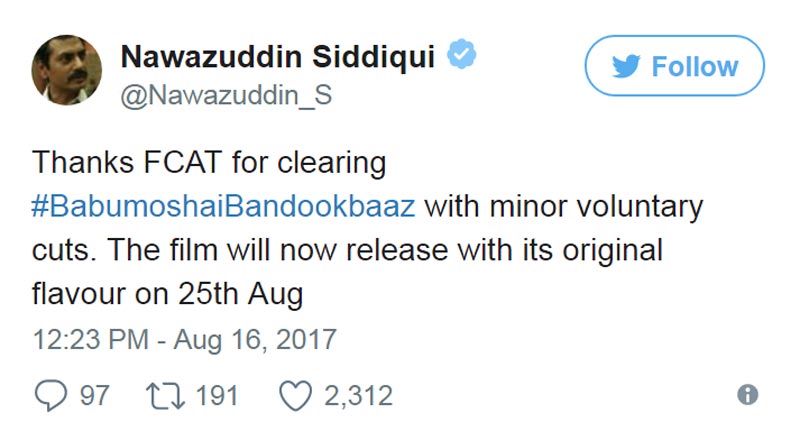 বেশ কিছু দৃশ্যে গালিগালাজ থাকাতে তীব্র আপত্তি জানিয়েছিলেন তদানীন্তন সেন্সর বোর্ড প্রধান পহেলাজ নিহলানি। তাতে নওয়াজ জবাব দিয়েছিলেন, ‘ছবির প্রয়োজনেই ওই সব দৃশ্যে গালিগালাজ রয়েছে।’ ‘এফক্যাট’ কর্তৃপক্ষ কর্তৃক ‘বাবুমশাই বন্দুকবাজ’কে ছাড়পত্র দেওয়ার পর বেশ খুশি নওয়াজউদ্দিন সিদ্দিকি। টুইটারে নওয়াজ লিখেছেন, ‘বাবুমশাই বন্দুকবাজ-কে ছাড়পত্র দেওয়ার জন্য এফক্যাট-কে ধন্যবাদ।’ কুশন নন্দী পরিচালিত এবং নওয়াজউদ্দিন সিদ্দিকি, বিদিতা বাগ অভিনীত ‘বাবুমশাই বন্দুকবাজ’ মুক্তি পাবে আগামী ২৫ অগস্ট।