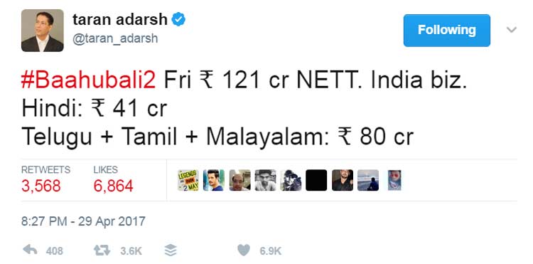মুক্তির প্রথম দিনেই মোট ১২১ কোটি টাকার ব্যবসা করেছিল বাহুবলী ২। কিন্তু এর মধ্যে তামিল, তেলুগু এবং মালয়ালম ভাষায় মুক্তি পাওয়া ছবি থেকেই মোট ৮০ কোটি টাকা আয় করেছে এসএস রাজামৌলির এই ছবিটি। অর্থাত্, হিন্দি ভাষায় মুক্তি পাওয়া ‘বাহুবলী ২’ প্রথম দিনে মোট ৪১ কোটি টাকার ব্যবসা করেছে। যা একেবারে হিসেব কষে জানিয়ে দিয়েছেন বলিউড বাজার বিশেষজ্ঞ এবং ফিল্ম সমালোচক তরণ আদর্শ। আর এখানেই বাজিমাত করেছেন বলিউডের ‘বাজিগর’ শাহরুখ। তাঁর অভিনীত ‘হ্যাপি নিউ ইয়ার’ ছবিটি মুক্তির দিনে ৪২ কোটি টাকার ব্যবসা করেছিল।