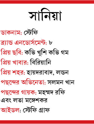 হায়দরাবাদে থাকুন বা দেশের অন্য কোনও প্রান্তে, সপ্তাহে অন্তত এক দিন বিরিয়ানি চাই-ই-চাই সানিয়ার। হায়দরাবাদে থাকলে নিজের অ্যাকাডেমির কাজে ব্যস্ত থাকেন টেনিস আইকন। তা সত্ত্বেও বন্ধুদের সঙ্গে আড্ডা আর সলমন খানের সিনেমা মিস করেন না কখনও। ‘‘ও হল পুরোপুরি হায়দরাবাদি, যাঁর কাছে জীবনের ছোট ছোট আনন্দগুলো খুব গুরুত্বপূর্ণ,’’ বলছিলেন বন্ধু কিরণ। ফ্রেঞ্চ ওপেন খেলতে যাওয়ার আগে শেষ বার যখন শহরে এসেছিলেন তখন সঙ্গে ছিলেন স্বামী ও পাকিস্তানি ক্রিকেটার শোয়েব মালিক। ‘‘নিয়মিত পার্টি হত, আড্ডা, খাওয়া-দাওয়া...’’ বলছিলেন ছোটবেলার বন্ধু।