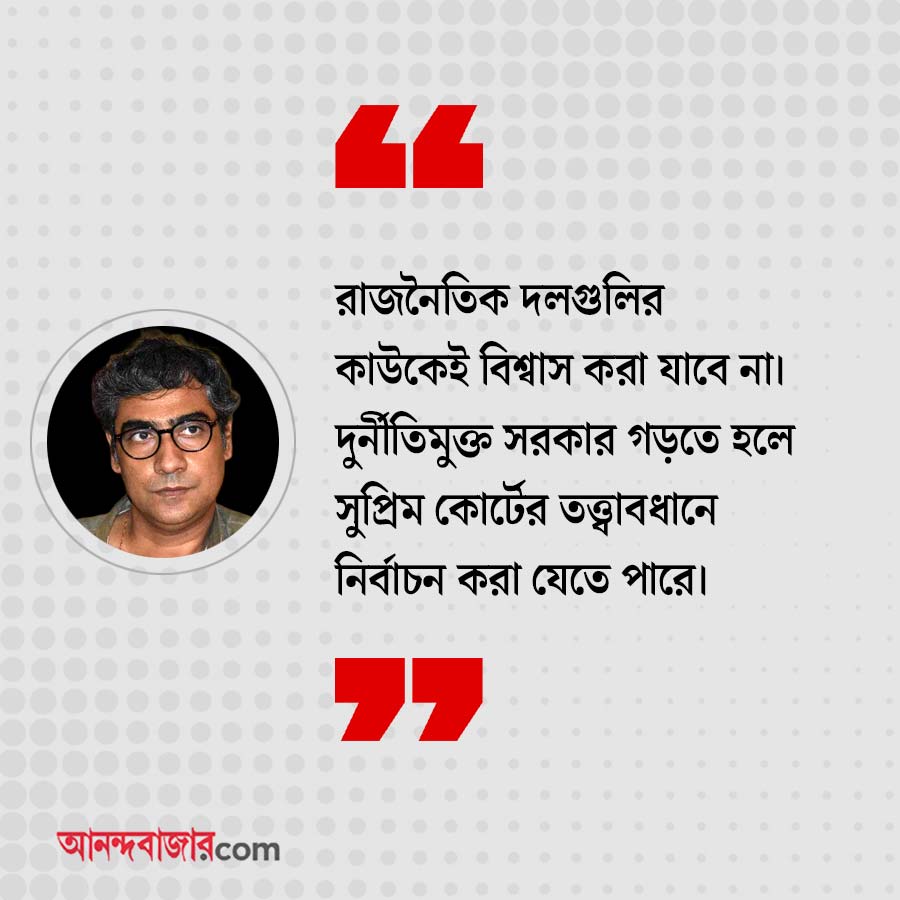 কৌশিক: নিয়ম করে কিছু হবে না। বিজেপি প্রমাণের চেষ্টা করছে যে, তারা দুর্নীতিমুক্ত। পশ্চিমবঙ্গে দুর্নীতিমুক্ত সরকার দেবে। এ দিকে, তৃণমূল বলছে, বিজেপিশাসিত রাজ্যে বিরাট দুর্নীতি। দুটোই সত্যি। অর্থাৎ, রাজনৈতিক দলগুলির কাউকেই বিশ্বাস করা যাবে না। দুর্নীতিমুক্ত সরকার গড়তে হলে, সুপ্রিম কোর্টের তত্ত্বাবধানে নির্বাচন করা যেতে পারে। তার মাথায় যাঁরা থাকবেন, তাঁদের প্রভাবমুক্ত হতে হবে।