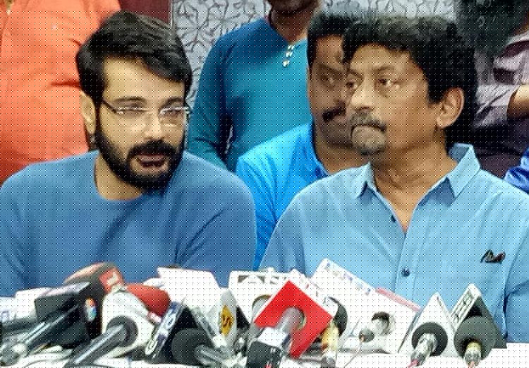 টেকনিশিয়ান স্টুডিওতে সাংবাদিকদের মুখোমুখি প্রসেনজিত্ ও গৌতম ঘোষ। — নিজস্ব চিত্র।