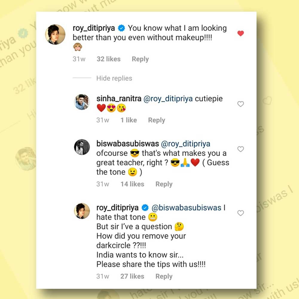 তবে শুধু দিদিমণি আর ছাত্র নয়, দিদা আর নাতির সম্পর্কে বিস্তর খুনসুটিও আছে। বিশ্বাবসু জানালেন, ‘‘আমাদের সম্পর্ক তো ‘লেগ-পুলিং’য়ের। তার প্রমাণ আমাদের ইনস্টাগ্রাম প্রোফাইলেই রয়েছে।’’ ‘আফটার মেকআপ’-এর ছবি আপলোড করেছিলেন বিশ্বাবসু। পাশে কোলাজে ছিলেন তাঁর শিক্ষিকা। মেকআপ শেখানো এবং তা নিয়ে খুনসুটির হরেক প্রমাণ সেখানেও পাওয়া গেল।