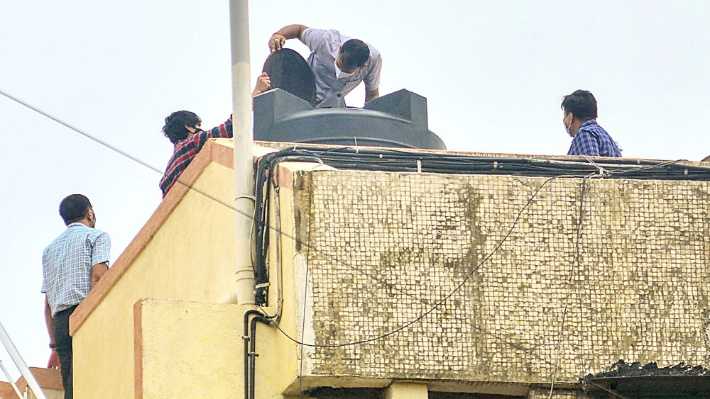 সুশান্ত সিংহ রাজপুতের বান্দ্রার বাড়ির ছাদে সিবিআই গোয়েন্দারা। শনিবার মুম্বইয়ে। ছবি: পিটিআই।