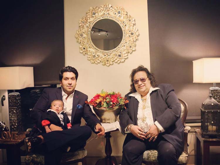 তিন প্রজন্ম। বাপ্পি লাহিড়ির সঙ্গে রয়েছেন ছেলে বাপ্পা ও নাতি কৃষ। ছবি: বাপ্পি লাহিড়ির সৌজন্যে।
