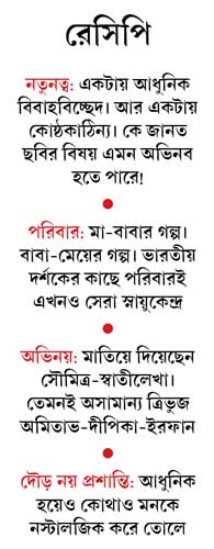 অভিনয় নিয়ে কিছু না লেখাই ভাল। সুপারস্টারদের বড় মাপের অভিনেতা হতে দেখার সুযোগ যখন ঘটে, তখন তার তৃপ্তিই আলাদা। দিনের পর দিন ‘বাবুমশাই’ যে উচ্চতায় নিজেকে নিয়ে যাচ্ছেন, তা এই ছবি না দেখলে বোঝা যায় না। তবে আমার বিশ্বাস, বাংলা উচ্চারণ আরও একটু ভাল করতে পারেন উনি। কেন করলেন না জানি না! ইরফানের স্বাদ আমি কলকাতায় বসে ঋত্বিককে দিয়ে মেটাই। অমন আধুনিক ও বড় মাপের অভিনেতা একটু এক রকম হলেও এত স্বাভাবিক ও বুদ্ধিদীপ্ত, কিছু বলার থাকে না। যিশু বেশ ভাল কাজ করল এ ছবিতে। ‘বরফি’র অতৃপ্তি এ ছবিতে একটু মিটল। রঘুবীর যাদব আমার ছোটবেলার হিরো। আজও তাই। ওকে যেন কত চিনি, জানি, ভালবাসি, দয়া হয়, কান্না পায়! মৌসুমী চট্টোপাধ্যায় একদমই মৌসুমী এ ছবিতে। উজ্জ্বল উপস্থিতি তাঁর।