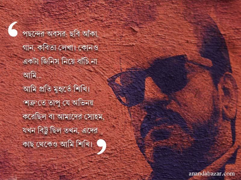 দেখুন, ভালটা যদি এতটা দেওয়া হয়, তা হলে তার ভ্যালুটা আর থাকে না। বিষয়টা এমন যে, ও তো খারাপ কখনও করেই না। সবাই ওয়ান্ডারফুল, এটা হতে পারে? আমি তো তা হলে স্ট্যান্ডার্ডটাই বুঝি না। ফাটাফাটিটা বলে দেওয়ার পরে তার ওপরের কিছু এলে সেটা তো আর কিছু দিতেই পারব না। আসলে আমরা সবাই বিক্রি হয়ে গিয়েছি। সমাজটা বিক্রি হয়ে গিয়েছে। একটা নতুন যুগ আমাদের এমবিএ পড়িয়েছে। ম্যানেজমেন্ট। আমরা ম্যানেজ করতে শিখেছি। তাই সব লোককেই ভাল বলা ভাল। আমার পক্ষে তো সেফ।