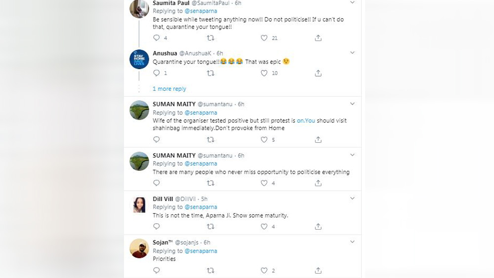 এর পরেই নেটাগরিকদের রোষের মুখে পড়েন অপর্ণা। ওই কমেন্ট সেকশনে নেটাগরিকদের একাংশ লেখেন, “এই চরম দুঃসময়েও রাজনীতি করতে ইচ্ছা করছে আপনার?” অনেকে আবার অপর্ণার জিভকে কোয়রান্টিনে পাঠানোরও নিদান দেন। যদিও গোটা ঘটনায় এখনও কোনও মন্তব্য করেননি অপর্ণা।