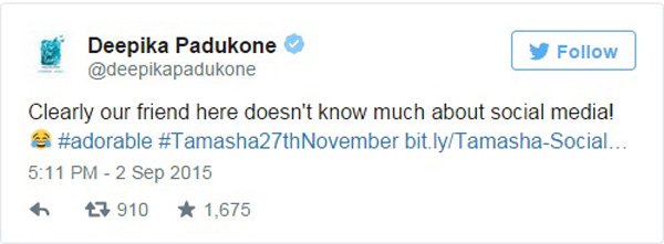 অবশ্য যা রটে, তার কিছু তো ঘটেই! রণবীরকে নিয়ে হালফিলে একটু বেশিই উচ্ছ্বাস দেখা যাচ্ছে দীপিকা পাড়ুকোনের। নায়িকা সদ্য তাঁর আর রণবীরের নিরালা সময় কাটানোর একটা ভিডিও পোস্ট করেছেন ফেসবুকে। সেখানে দেখা যাচ্ছে, একটা রেরকর্ডার হাতে পুরনো প্রেমিকের সঙ্গে খুনসুটিতে মেতেছেন তিনি। জিজ্ঞেস করছেন, “বলো দেখি, আমাদের নতুন ছবি তামাশা-র সোশ্যাল পার্টনার কারা?” রণবীর তাঁর প্রশ্নের উত্তর দিতে না পারলে বিজয়িনীর উচ্ছ্বাস নিয়ে টুইটে লিখেছেন দীপিকা, “দেখুন দেখি, আমাদের এই বন্ধুটি সোশ্যাল মিডিয়া নিয়ে কিচ্ছুটি জানে না!”