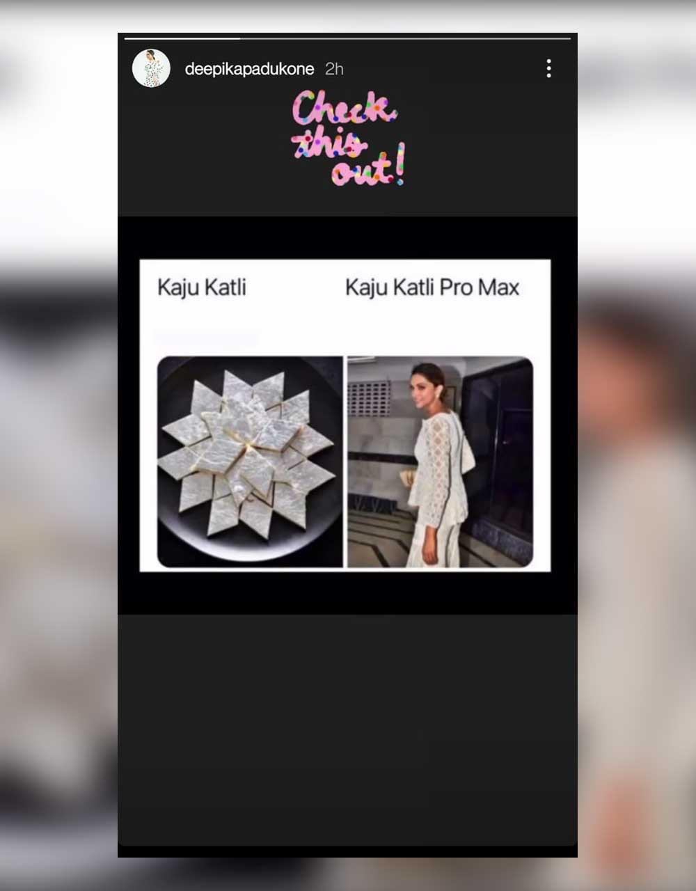দীপিকার একটি পুরনো ছবি দিয়ে তৈরি হল মিম। বলিউডের মস্তানির পোশাককে কাজু বরফির সঙ্গে তুলনা করা হয় সেখানে। দীপিকার পরনে ছিল ঘিয়ে রঙা হাতঢাকা একটি টপ এবং ওই একই রঙের প্লাজো। সেই ছবির পাশাপাশি কাজু বরফির ছবি রেখে, দুইয়ের মধ্যে সাদৃশ্য তুলে ধরেছেন এক নেটাগরিক। সেই মিম এ বার চোখে পড়ে গেল নায়িকার।