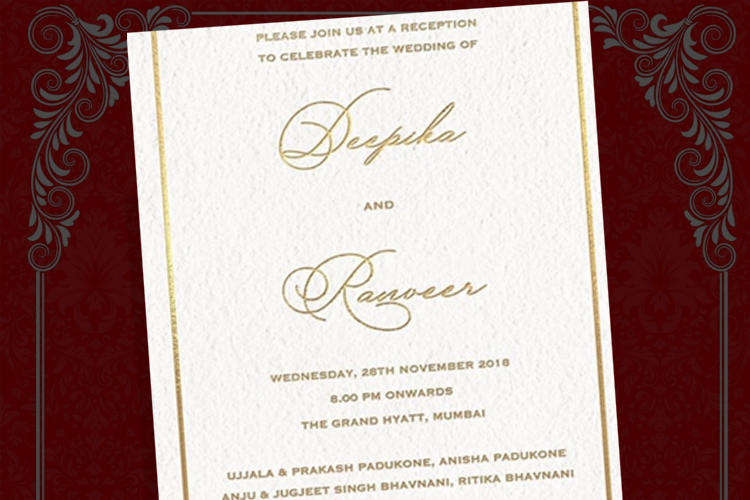 সোমবার সোশ্যাল মিডিয়ায় একটি নিমন্ত্রণ পত্র ভাইরাল হয়েছে। সেখানে দেখা যাচ্ছে, আগামী ২৮ নভেম্বর নাকি মুম্বইতে এই জুটির রিসেপশন। দ্য গ্র্যান্ড হায়াতে হবে এই অনুষ্ঠান। রণবীর এবং দীপিকার বাবা-মায়ের নাম কার্ডে ছাপা রয়েছে। তাঁরাই সকলকে আমন্ত্রণ জানিয়েছেন।