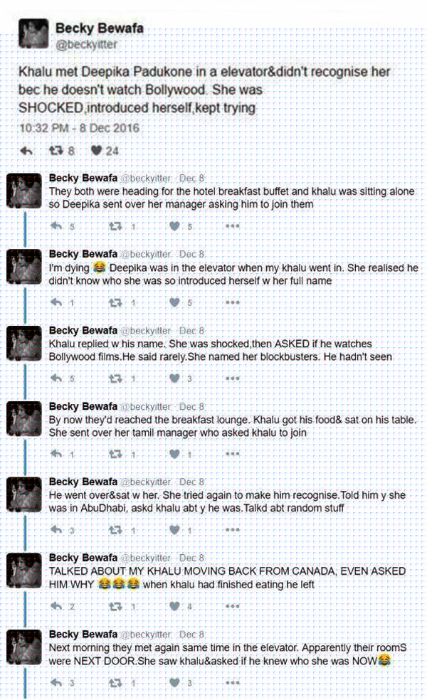 ‘বেকি বেওয়াফা’র টুইট বলছে, ‘লিফট থেকে বেরিয়ে পাঁচতারার ডাইনিং হলেও বৃদ্ধর পিছু নেন দীপিকা। বৃদ্ধ যে টেবিলে বসেন তাঁর অদূরেই একটি টেবিলে বসে দীপিকা নিজের ম্যানেজারকে ডেকে পাঠান। বৃদ্ধকে দেখিয়ে ম্যানেজারকে দীপিকা বলেন, তাঁর পরিচয় ভাল করে বুঝিয়ে এই টেবিলে নিয়ে আসতে। কিন্তু ম্যানেজার সে চেষ্টায় ব্যর্থ হন। কারণ, সব শোনার পরেও দীপিকার সঙ্গে কথা বলার জন্য একটুও উৎসাহ দেখাননি বৃদ্ধ।’ টুইটারের এই গল্প কিন্তু এখনও শেষ হয়নি! এর পর ‘বেকি বেওয়াফা’র টুইটে বলা হয়েছে, ‘পরের দিন আবার লিফটে ওই বৃদ্ধ ভদ্রলোক এবং তাঁর ভাগ্নীর সঙ্গে দেখা হয়ে যায় দীপিকার। দীপিকা হেসে বৃদ্ধের কাছে জানতে চান, “এতক্ষণে আমি কে সেটা নিশ্চয়ই জেনে গিয়েছেন?” কিন্তু দীপিকাকে হতাশ করে স্রেফ দু’ দিকে মাথা নেড়ে ‘না’ জানিয়ে দেন ভদ্রলোক!’ গল্প এখানেই শেষ হয়েছে। আর এখান থেকেই শুরু হচ্ছে নানা জল্পনা। এই গল্পের কয়েকটি বিষয় বেশ অবাক করার মতোই!