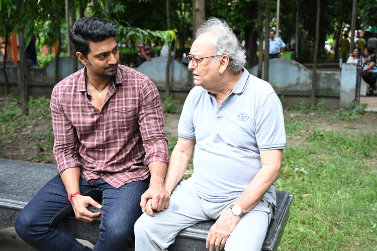 পার্কে যখন শুট চলছে, তখনও আশপাশে উৎসুক চোখের ভিড়। এক সময়ে আকাশের মুখ ভার হয়ে কয়েক ফোঁটা বৃষ্টিও পড়ল। ছাতা মাথায় শুট চলল কিছুক্ষণ। পরে আলাপচারিতার জন্য সৌমিত্র ও দেবকে যখন একসঙ্গে পাওয়া গেল, দেবের প্রশংসায় উচ্ছ্বসিত প্রবীণ অভিনেতা, ‘‘মানুষ হিসেবে ওর ব্যবহার সুন্দর, উষ্ণ, সৌজন্যমূলক।’’ দেবের ছবি দেখেছেন কখনও? ‘‘গোটা ছবি দেখার অবসর হয়নি। স্নিপেট দেখেছি। দেবের চেহারা আমার পছন্দের। ওর নাচটাও দেখেছি,’’ বললেন সৌমিত্র।