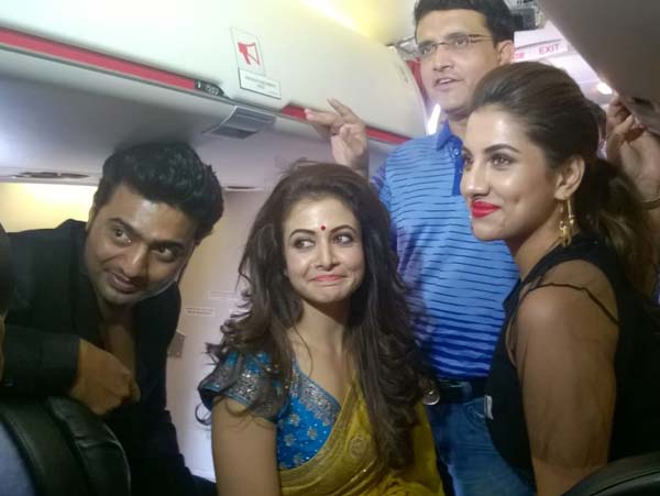 বিমানের ভিতর সৌরভ, দেব, রুক্মিণী, কোয়েল। — নিজস্ব চিত্র।