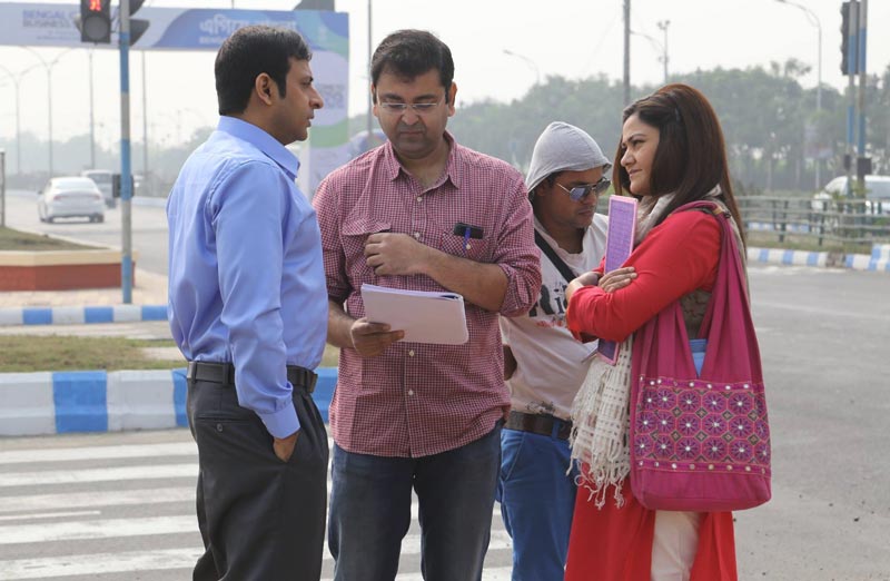 জয় ও কনীনিকাকে শট বোঝাতে ব্যস্ত পরিচালক। ছবি: ইন্দ্রাশিস আচার্যের ফেসবুক পেজের সৌজন্যে।