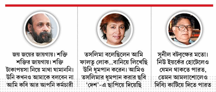 দেখুন প্রমাণপত্র নিয়ে আমি বসে আছি। কেউ ফোঁস করলেই উত্তর দেব। তসলিমার চিঠির উত্তর আমিও ‘দেশ’-এ দিয়েছি। তসলিমা বলেছিলেন আমি ফালতু লোক, মিথ্যেবাদী। বানিয়ে বানিয়ে লিখেছি উনি ধূমপান করেন। আমি অমনি তসলিমার ধূমপান করার ছবি ‘দেশ’-এ ছাপিয়ে দিয়েছি। দরকার হলে আরও দেব। এত রিঅ্যাক্ট করার কী আছে? পরের লেখায় তো লিখেছি তসলিমা কত জনপ্রিয় লেখিকা ছিলেন। ওঁর ‘নির্বাচিত কলাম’, ‘লজ্জা’ যে রকম হুহু করে বিক্রি হয়েছিল, খুব কম লেখকের বই-ই এত দ্রুত বিক্রি হয়েছে। এগুলোও তো লিখছি। সে সব পড়লেনই না। একটু অপেক্ষাও করলেন না। দুম করে আমাকে যা নয় তাই বলতে শুরু করে দিলেন।