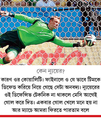 কারণ ওর কোয়ালিটি। ফাইনালে ও যে ভাবে টিমকে ডিফেন্ড করিয়ে নিয়ে গেছে সেটা অনবদ্য। ন্যুয়েরের ওই ডিফেন্সিভ টেকনিক না থাকলে মেসি আগেই গোল করে দিত। আর একবার গোল খেলে মনে হয় না ম্যাচে আমরা ফিরতে পারতাম বলে।