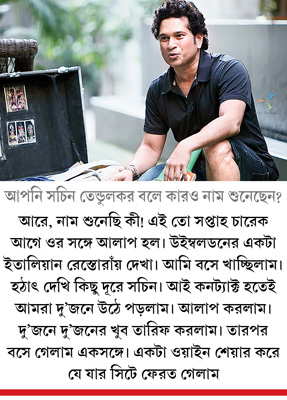 একদম হঠাৎ করে দেখা। আমি বসে খাচ্ছিলাম। হঠাৎ দেখি কিছু দূরে সচিন। আই কনট্যাক্ট হতেই আমরা দু’জনে উঠে পড়লাম। আলাপ করলাম। দু’জনে দু’জনের খুব তারিফ করলাম। তারপর বসে গেলাম একসঙ্গে। একটা ওয়াইন শেয়ার করে যে যার সিটে ফেরত গেলাম।