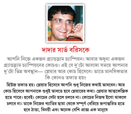 প্রশ্নটা হল, আপনি নিজে একজন গ্র্যান্ডস্লাম চ্যাম্পিয়ন। আবার অধুনা একজন গ্র্যান্ডস্লাম চ্যাম্পিয়নের কোচও। এই যে দু’টো আলাদা সময়ে আপনার দু’টো ভিন্ন অবস্থান— প্লেয়ার আর কোচ হিসেবে। তাতে মানসিকতার কি কোনও তফাত হয়?