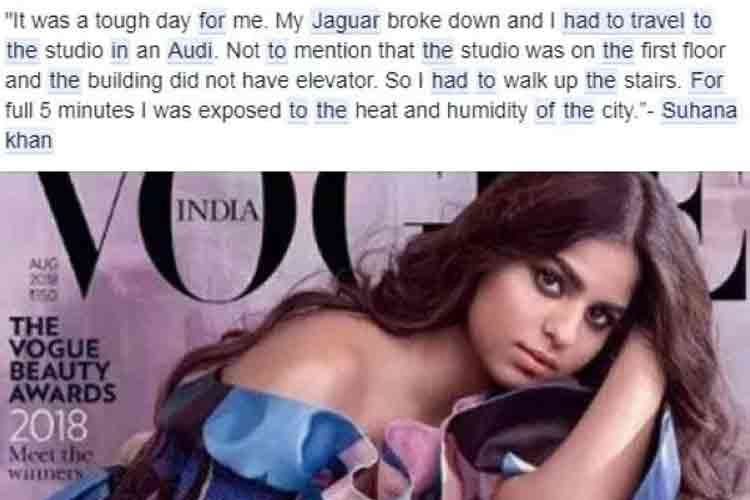এমনিতেই ‘ভোগ’-এর কভার গার্ল হওয়ার পর থেকেই সোশ্যাল মিডিয়ায় ট্রোল়ড হতে হচ্ছে এই স্টার কি়ডকে। কখনও শুনতে হয়েছে বাবার নাম শাহরুখ খান, সে কারণেই এই সুযোগ পেয়েছেন সুহানা। কখনও বা বলা হয়েছে, সুহানাকে কভার গার্ল করা মানে ‘ভোগ’-এর কোয়ালিটি কমে যাওয়া।