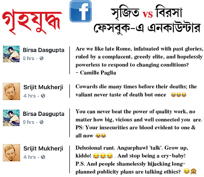 কারও উদ্দেশ্যে নয়। এ বার গত বছর থেকে আজকের কথায় আসি, কেমন? গত বছর ‘রাজকাহিনী’ বানিয়েছিলাম, সেটা এ বছরে হিন্দিতে রিমেক হচ্ছে উইথ বিদ্যা বালন। ছবিটা ১৯টা ফেস্টিভালে ঘুরেছে। ‘রাজকাহিনী’ রিলিজ হয়েছিল ৬৫টা হলে। বক্স অফিসে কামিয়েছিল সওয়া পাঁচ কোটি টাকা। অন্য একটা ছবি...