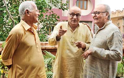 শ্যুটিংয়ের ফাঁকে আড্ডায় সৌমিত্র চট্টোপাধ্যায়, পরাণ বন্দ্যোপাধ্যায়, অরুণ মুখোপাধ্যায়। ছবি: কৌশিক সরকার।