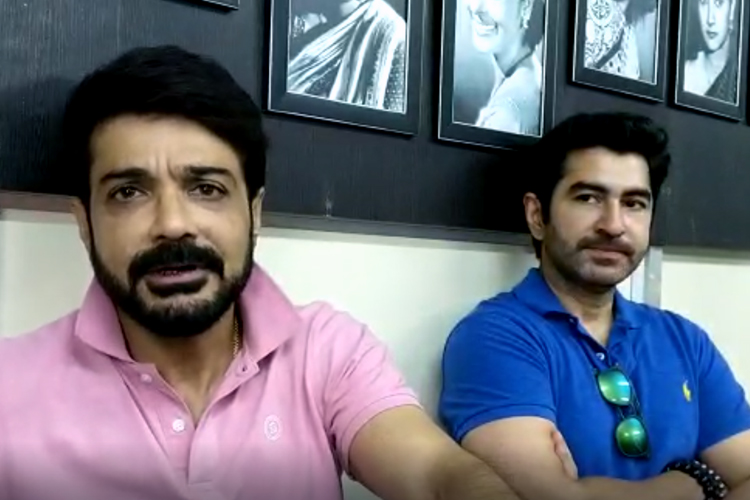 সাংবাদিকদের মুখোমুখি প্রয়েনজিত্ এবং জিত্।— নিজস্ব চিত্র।