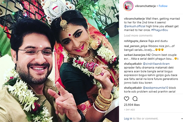 মহুল এবং রোদ্দুর অর্থাত্ ঐন্দ্রিলা সেন এবং বিক্রম চট্টোপাধ্যায়। কিন্তু বিক্রম নাকি এই নিয়ে দু’বার বিয়ে করলেন ঐন্দ্রিলাকে। ইনস্টাগ্রামে বিয়ের সাজে নিজেদের একটি ছবি শেয়ার করে এ কথাই লিখেছেন খোদ বিক্রম!