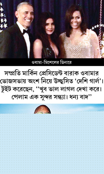 এই প্রিয়ঙ্কা চোপড়াকে কুর্নিশ জানাচ্ছে এখন গোটা পৃথিবী। জনপ্রিয় টেলিভিশন শো ‘কোয়ান্টিকো’য় অভিনয় করেছেন তিনি। অস্কারে আমন্ত্রণ পেয়েছেন নিজের আকর্ষণীয় ফ্যাশন স্টেটমেন্টের জোরে। নিয়মিত ওঠাবসা ডোয়েন জনসনের সঙ্গে। পোস্ট করছেন ছবি। সম্প্রতি মার্কিন প্রেসিডেন্ট বারাক ওবামার ভোজ সভায় অংশ নিয়ে উচ্ছ্বসিত ‘দেশি গার্ল’। টুইট করেছেন, ‘‘খুব ভাল লাগল বারাক ওবামা এবং মিশেল ওবামার সঙ্গে দেখা করে। পেলাম এক সুন্দর সন্ধ্যা। ধন্যবাদ।’’