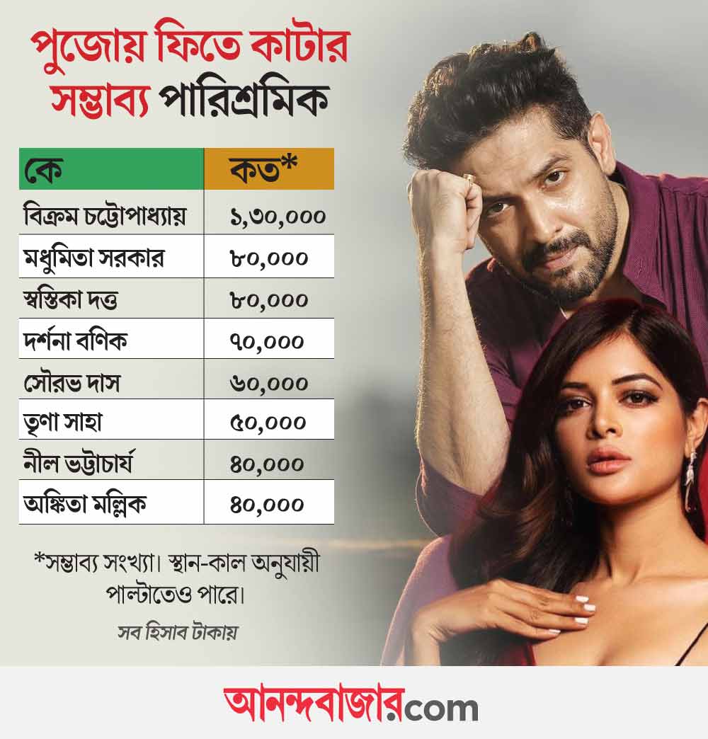 প্রতি বছরই কোন তারকার পারিশ্রমিক কত, তা জানতে বেশ পরিশ্রমই করতে হয় ক্লাবকর্তাদের, বিশেষত যাঁদের পুজো নতুন। গত কয়েক বছরে ধারা বদলেছে। আগে ছোটপর্দার অভিনেতাদের পারিশ্রমিক নির্ধারিত হত জনপ্রিয়তার নিরিখে। এখন ছোটপর্দা, বড়পর্দা, ওটিটি—মিলেমিশে একাকার। সমাজমাধ্যমের পাতায় অনুরাগীর সংখ্যা ঠিক করে দেয় তারকাদের পারিশ্রমিকের অঙ্ক। শোনা যাচ্ছে, পুজো উদ্বোধনের প্রতিযোগিতায় লক্ষ টাকার গন্ডি পেরিয়েছেন বিক্রম চট্টোপাধ্যায়। বাকিরা নাকি এখনও হাজারের গন্ডিতে আটকে। শোনা যাচ্ছে,এই প্রতিযোগিতায় তালিকার প্রথমের দিকে রয়েছে অভিনেত্রী মধুমিতা সরকারের নাম। বাকি কোন তারকা নেন কত পারিশ্রমিক? রইল তার আনুমানিক তালিকা।