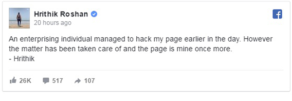 হৃতিক রোশনের ফেসবুক অ্যাকাউন্ট হ্যাকারের কবলে পড়েছিল। এখানেই শেষ নয়, সেই অ্যাকাউন্ট থেকে মিনিট কয়েক লাইভ স্ট্রিমিংও শুরু করে দিয়েছিল সেই হ্যাকার।