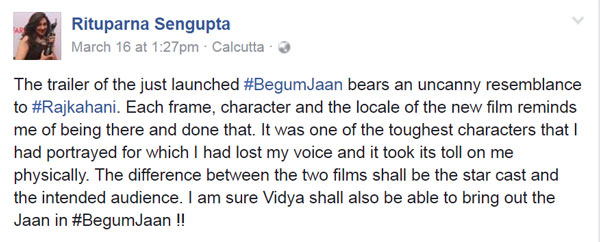 ঋতুপর্ণার সেই ফেসবুক পোস্ট। ছবি: ফেসবুকের সৌজন্যে।