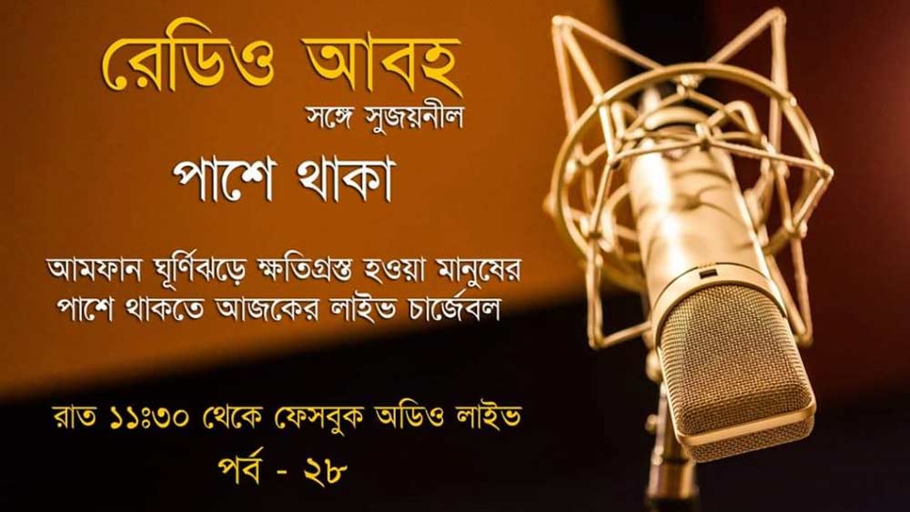 শুধু আমপানে বিধ্বস্ত মানুষের পাশেই নয়। সুজয়নীল অন্য দিকে গভীর রাতে ফেসবুক রেডিয়ো লাইভে মানুষের মনের কাছাকাছি পৌঁছে যাচ্ছেন। অবাক স্বরে বললেন সুজয়নীল, “জানেন, মেসেঞ্জারে এক মেয়ে লিখেছিলেন তাঁর বাবা তাঁকে ধর্ষণ করেছিলেন। তিনি আবার লড়াই করে নিজেকে প্রতিষ্ঠা করেছেন। এই লড়াইয়ের গল্প জানাই আমি সকলকে।” এ ভাবেই মানুষের মনের কাছে, মানুষের সঙ্গে হাত মিলিয়ে সুজয়নীলের ‘রেডিয়ো আবহ’ অতিমারি, অতি ঝড়ে দিকহারা মানুষের পাশে থাকছে।