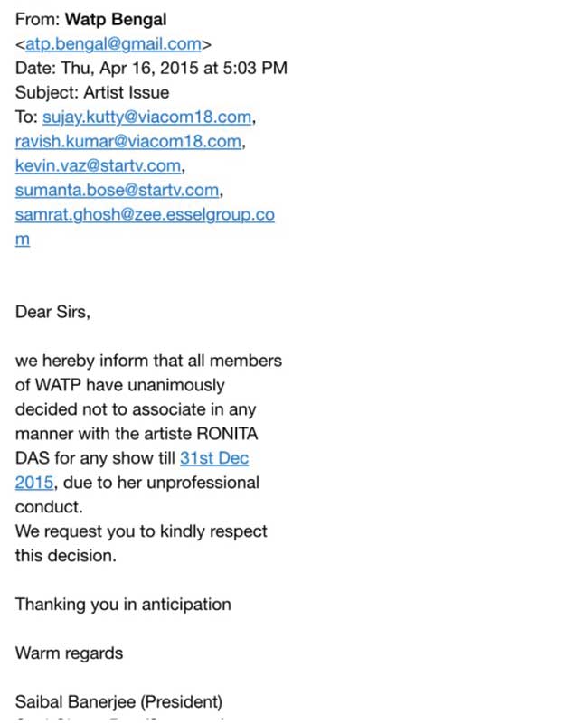 ওয়েলফেয়ার অ্যাসোসিয়েশন অব টেলিভিশন প্রোডিউসার্স (ডব্লুএটিপি) একটি চিঠি লেখে সব চ্যানেলের বড় কর্তাদের। সেই চিঠিতে স্পষ্ট লেখা আছে কোনও চ্যানেল এই বছর ডিসেম্বর অবধি রণিতার সঙ্গে কাজ করতে পারবে না তাঁর ‘আনপ্রফেশনাল কনডাক্ট’-এর জন্য। এবং এখানেই সংঘাত।