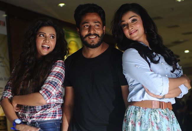 মঙ্গলবার দুপুরে হাওড়ার মলে আবার শ্যুটিং করলেন রাজ চক্রবর্তী। সঙ্গে দুই নারী। শুভশ্রী- সায়ন্তিকা। ছবি: সুব্রত কুমার মণ্ডল।