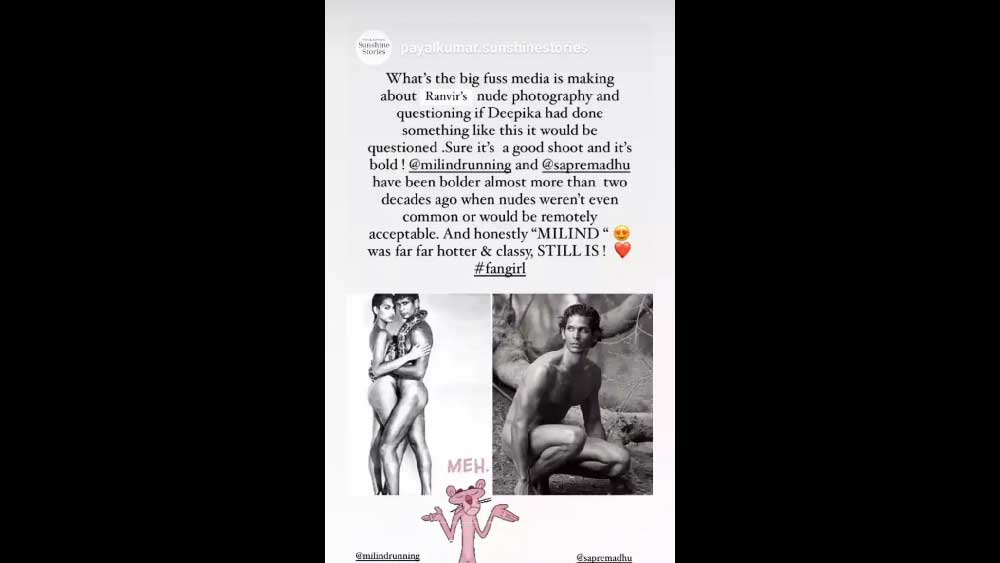 ২০২০ সালে সেই সব পুরনো ছবি সামনে এনে মিলিন্দ লিখেছিলেন, ‘২৫ বছর বয়সে তোলা। সেই সময়ে কোনও সোশ্যাল মিডিয়া ছিল না। ইন্টারনেটও ছিল বলে আমার মনে হয় না। এগুলো যদি এখন প্রকাশিত হত, তবে প্রতিক্রিয়া কী হত তাই ভাবছি।’
