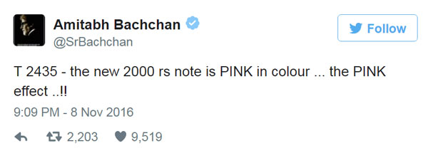 কী ভাবে জানেন? অমিতাভ টুইট করেছেন, ‘নতুন ২০০০ টাকার নোট পিঙ্ক রঙের। পিঙ্ক এফেক্ট!’ যদিও বলি বিশেষজ্ঞদের মতে, অমিতাভ এ কথা লিখেছেন নেহাতই মজা করে।