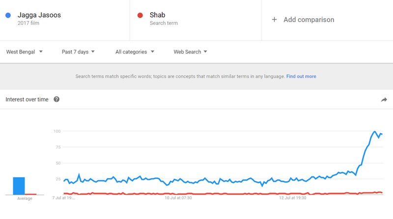 (দেখুন, নীল গ্রাফটি ‘জগ্গা জসুস’-এর। লাল গ্রাফটি ‘শব’-এর। গত ৭ জুলাই থেকে গুগল সার্চের হিসেবে অনেকটাই এগিয়ে অনুরাগের ছবি।)