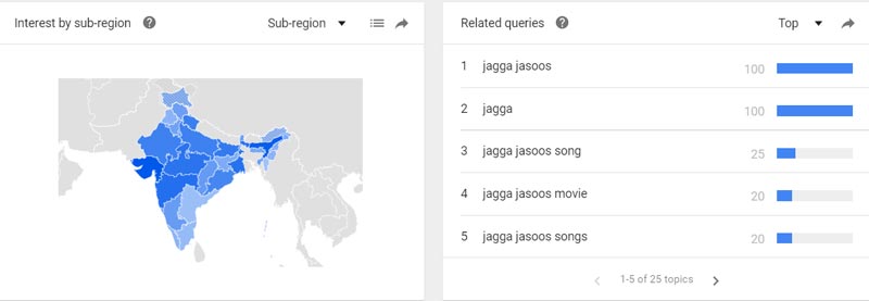 গত সাত দিনের হিসেবে ভারতে গুগল সার্চে অনেক এগিয়ে ‘জগ্গা জসুস’। ‘জগ্গা জসুস’, ‘জগ্গা’, ‘জগ্গা জসুস সং’, ‘জগ্গা জসুস মুভি’…উঠে এসেছে রিলেটেড সার্চে। অন্য দিকে বেশ কিছুটা পিছিয়ে পড়েছে ‘শব’। ‘শব মুভি’, ‘শব সং’, ‘শব এমপিথ্রি’ এসেছে রিলেটেড সার্চে।