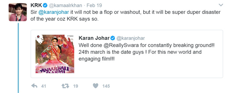 বিতর্কের সূত্রপাত কর্ণ জোহরের নতুন ছবি ‘আনারকলি অব আরাহ’কে ঘিরে। সম্প্রতিই ছবির পোস্টার টুইটারে প্রকাশ করেন কর্ণ জোহর। জানান, ২৪ মার্চ ওই ছবিটি মুক্তি পাওয়ার কথা। কর্ণের সেই পোস্টের নীচে মন্তব্য করেন কে আর কে। ভোজপুরি ফিল্মের এই তারকা বলেন, ‘এই ছবি যে শুধু ফ্লপ হবে তাই নয়, এই বছরের বলিউডের সবচেয়ে বড় বিপর্যয় হবে এই ছবি।’