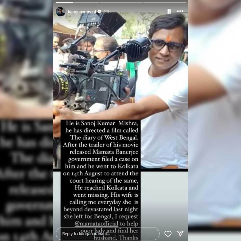 ইনস্টাগ্রামে স্টোরিতে কঙ্গনা পরিচালকের ছবি দিয়ে লেখেন, “ইনি সনোজ কুমার মিশ্র। ‘দ্য ডায়েরি অফ ওয়েস্ট বেঙ্গল’ নামে একটি ছবির পরিচালনা করেছেন। ছবির ট্রেলার মুক্তি পাওয়ার পরে পশ্চিমবঙ্গ সরকার এই পরিচালকের বিরুদ্ধে অভিযোগ দায়ের করে। গত ১৪ অগস্ট সেই মামলার শুনানির জন্য তিনি কলকাতায় গিয়েছিলেন। কিন্তু তার পরে তিনি নিখোঁজ হয়ে যান।”