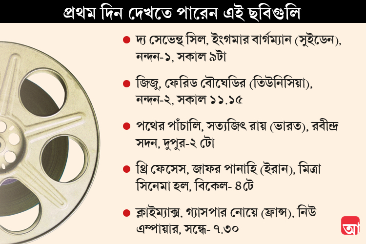 আগামী সাতদিন ধরে নন্দন, রবীন্দ্র সদন-সহ মোট ১৬ টি সিনেমা হলে ছবি দেখানো হবে। এবছরের উদ্বোধনী ছবি ‘অ্যান্টনি ফিরিঙ্গি’। প্রতিদিন গড়ে প্রায় ৫০টি ছবি থাকবে তালিকায়। যার মধ্যে পাঁচটি ছবি দেখা সম্ভব। দেখে নিন প্রথম দিন কোন পাঁচটা ছবি দেখা যেতে পারে।