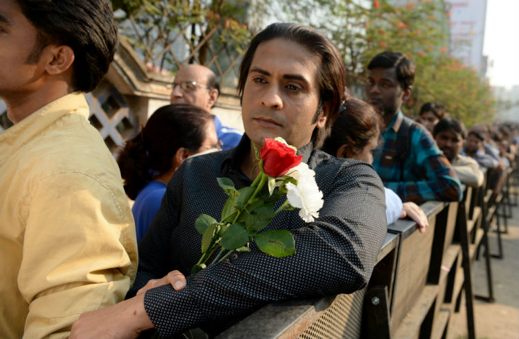 ভিড়ের মাঝে অধীর অপেক্ষায় শ্রীদেবীর ফ্যান। ছবি: এএফপি।