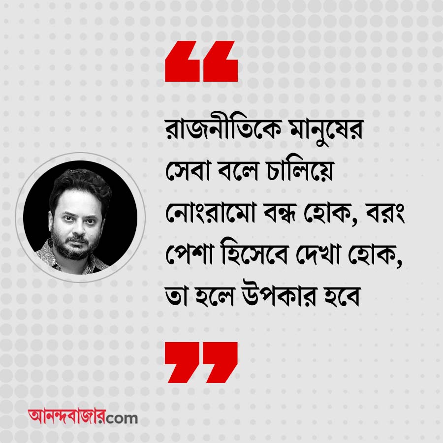 রাহুল: ভালই হয়। ইঞ্জিনিয়ার, চিকিৎসকের তুলনায় অনেক কম সংখ্যক মানুষ পার্লামেন্ট বা বিধানসভায় যাওয়ার জন্য মনোনীত হন। ১৪০ কোটি মানুষের দেশে কত জন আর বিধায়ক-সাংসদ হন? তাই পরীক্ষা হলে ভাল হয়। জেতার পর প্রশিক্ষণও দরকার। আমরা কেন রাজনীতিকে মানুষের সেবা বলে চালিয়ে তার পিছনে এত নোংরামি করতে থাকি? তার বদলে সম্পূর্ণ ভাবে এটিকে একটি পেশা হিসেবে নিয়ে তার জন্য পরীক্ষা, প্রশিক্ষণ ইত্যাদির বন্দোবস্ত করা হোক না কেন!